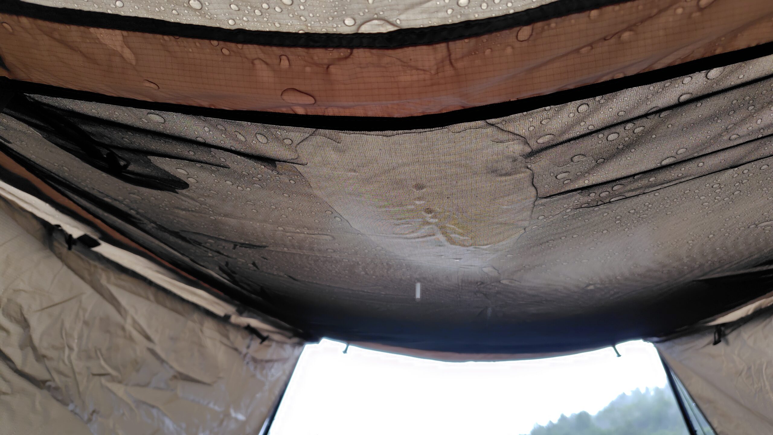 この状態で雨が降るとアウターとメッシュの隙間に雨水が入り