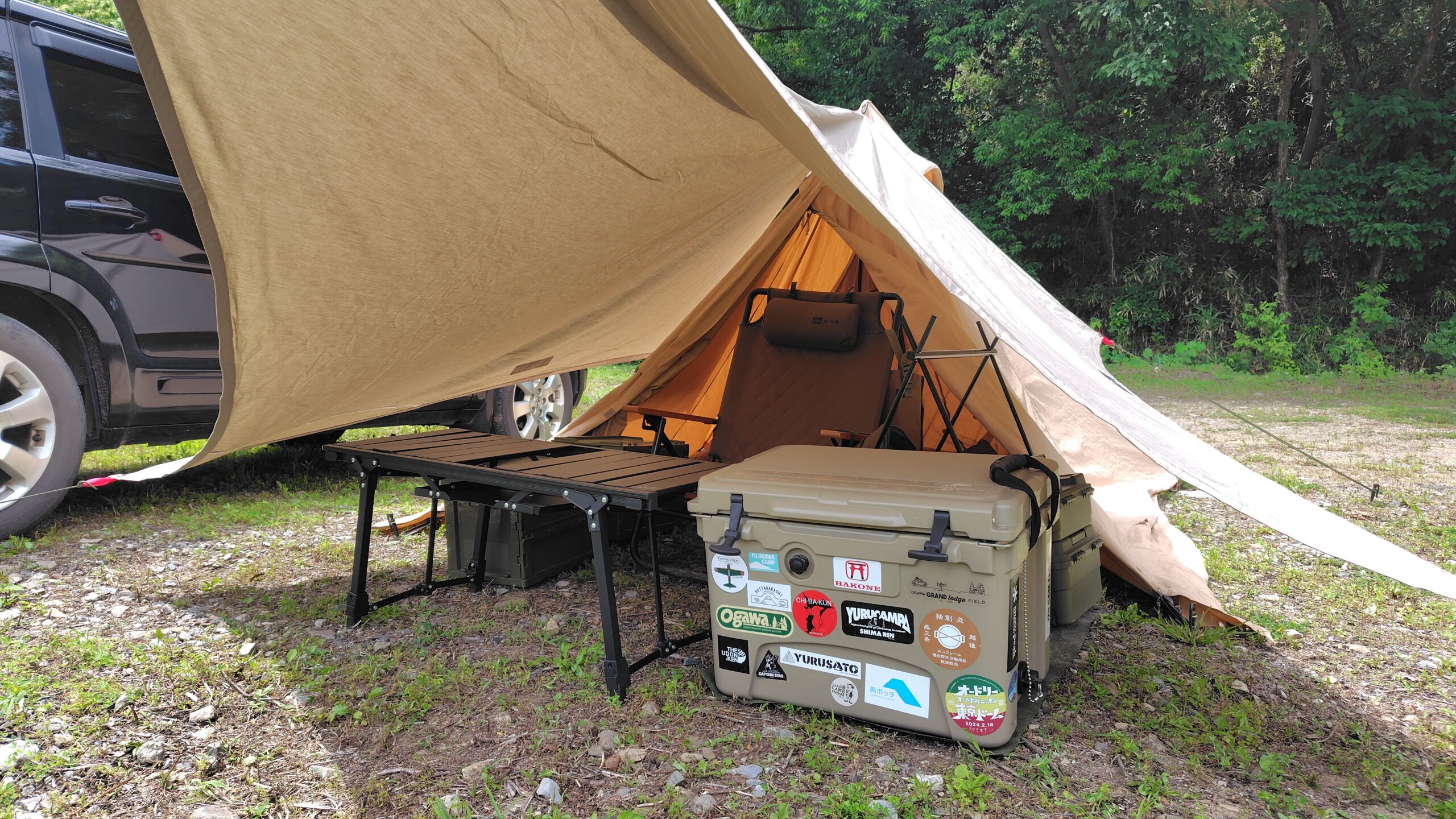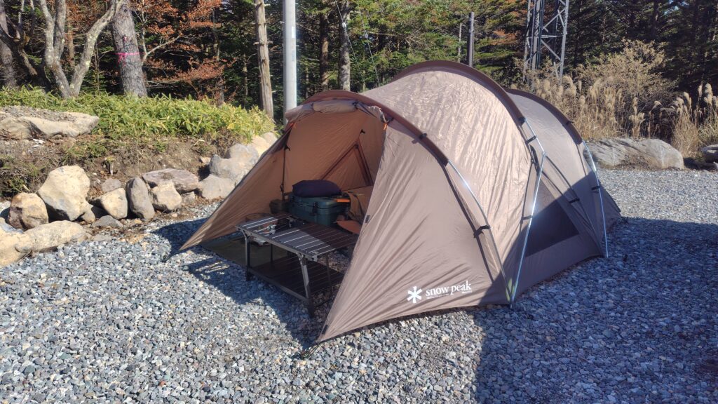 今回はユニフレームの焚き火テーブルと共に主力テーブルとなっている
